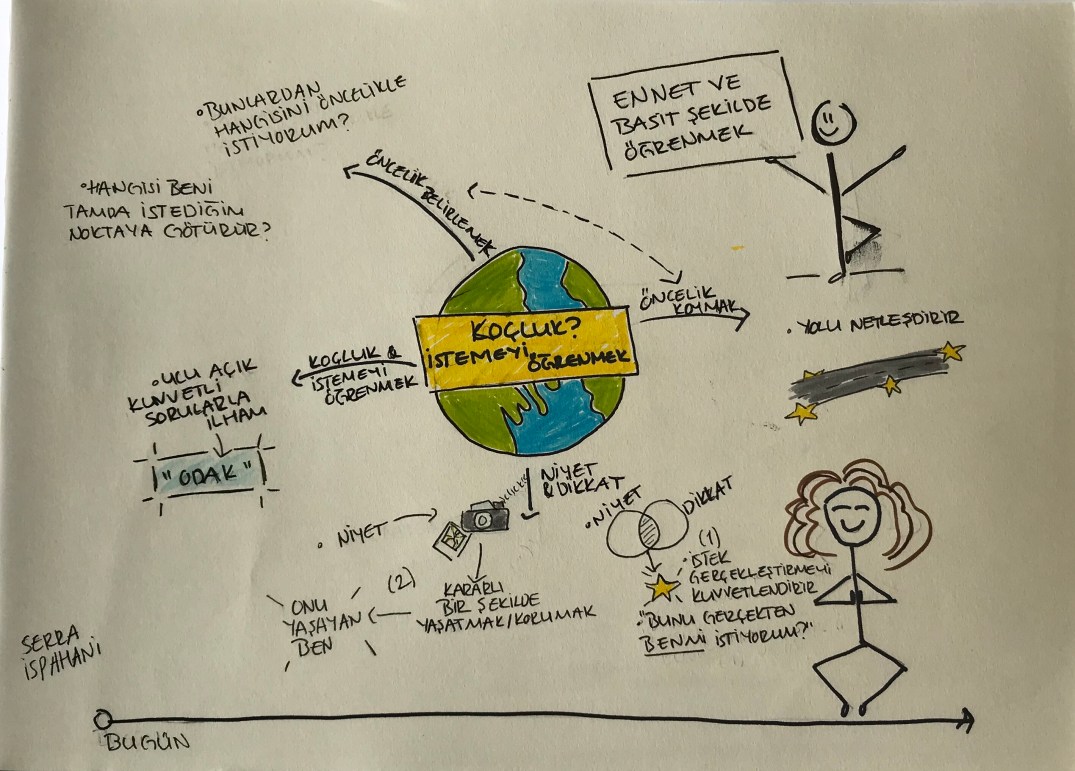 Koçluk görüşmelerinde koçların belki de en önemli görevlerinden biri koçluk alan kişi odaklı ucu açık kuvvetli sorular sorarak yönlendirme yapmadan ilham vermektir. Görüşme sırasında kişinin odağını birşeye indirir ve sadece onu düşünmesini sağlar. Böylece koçluk alan isteğini daha kuvvetli bir şekilde iletir. Marlyn Atkinson bir yazısında niyet etme ile dikkat konusunda bahsediyor. İkisinin birleştiği yerde istekleriniz en başından arzuladığınız şekilde gerçekleşiyor. (1)