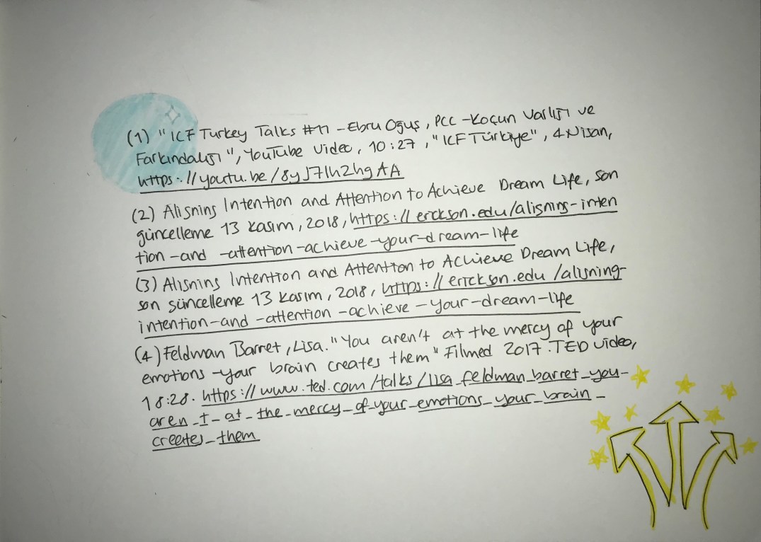 (1) ”ICF Turkey Talks #11 – Ebru Oğuş, PCC – Koçun Varlığı ve Farkındalığı”, YouTube Video, 10:27, “ ICF Türkiye” , 4 Nisan, https://youtu.be/8yJ7lh2hgAA