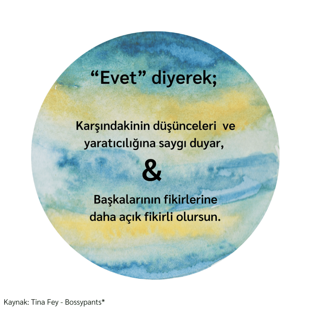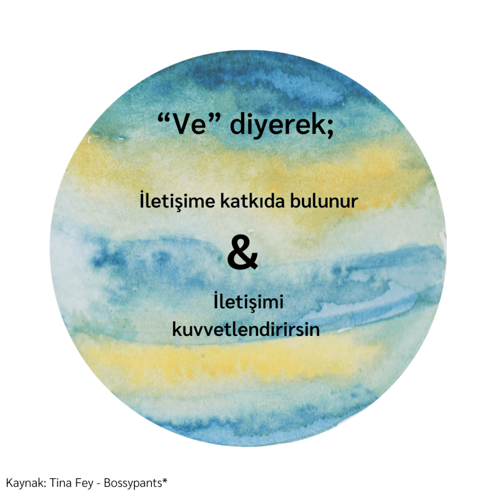 Fakat, Fey benim düşünme sistemimi destekleyen noktalarda da bulunuyor. İlk olarak karşı tarafın yaklaşımına açık fikirli – ben empati kurarak şeklinde de düşündüm- bir konumdan yaklaş diyor. Eğer karşındaki olmasa bile “Elimde bir kutu var” diyorsa, aynı yoldan devam etmelisin. Böylece, onun zihninde yarattığı resmi görür ve yaratıcılığına saygı göstermiş olursunuz. Bu bakış açısının dikkat çeken yanlarından başka bir tanesi ise, iletişime katkıda bulunmak. Burada “ve” kısmı çok önemli. Aslında ekleme yaparak sadece kendini daha fazla tanımıyor, devam eden iletişimi de güçlendiriyorsunuz. (3)