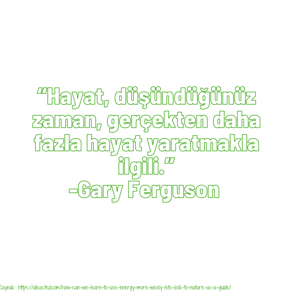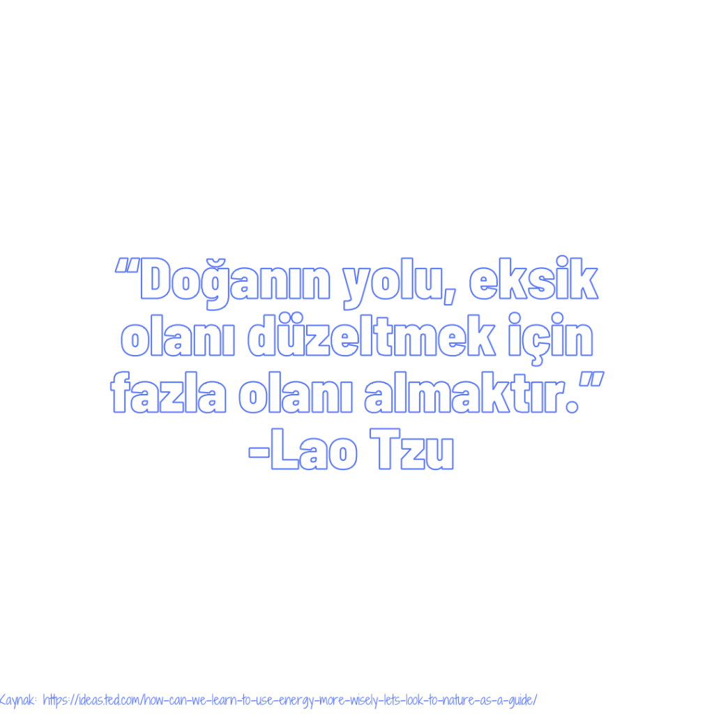 Yukarıda yazan Lao Tzu’nun karşıma çıkan en güzel alıntılarından biri olabilir. Ana kavramına bakarsam, karşıma denge çıkıyor. Denge özellikle bu kadar kaynak olan dünyamızda çok önemli. Sonsuz etkisi olabilecek kaynaklar ve kullanma şeklimize göre şekillenebilecek sonuçlar bulunuyor. Tzu’nun da söylediği gibi, yaşam bu kaynakları daha fazla yaşam yaratmak amacı ile kullanıyor. Örnek vermek gerekirse, güneş her canlıya fazlasıyla yetecek kadar enerjiyi çok kısa diyebileceğimiz süreler içinde bize sunuyor. Bu enerjiyi nasıl kullandığımız sadece bizi değil, diğer canlıları da etkiliyor. Doğa kendi içinde bu denge işini çözmüş. Hatta, kendi vücutlarımız da bu dengeyi koruyor. (1)