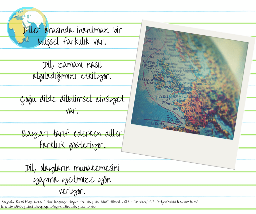 Biz insanlar inanılmaz bir yeteneğe sahibiz; dil. Dil düşünme sistemimizi yukarıda yazan bulgulardan dolayı şekillendiriyor. Farkında olmadan konuştuğumuz dilin etkilerini yaşıyoruz. Cinsiyet, yön, zaman ve birçok algımız dil ile şekillenebiliyor.